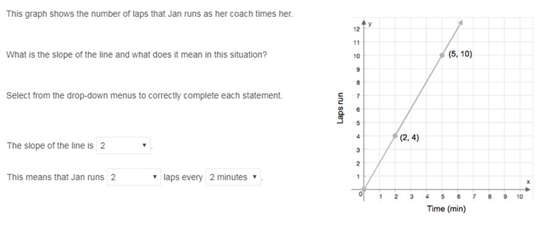 You found the slope correctly, but the function is not correct. If you look at the graph, you can see that Jan actually runs two laps every one minute. (2,4) explains that she ran 4 laps in 2 minutes. (5,10) explains that she ran 10 laps in 5 minutes.