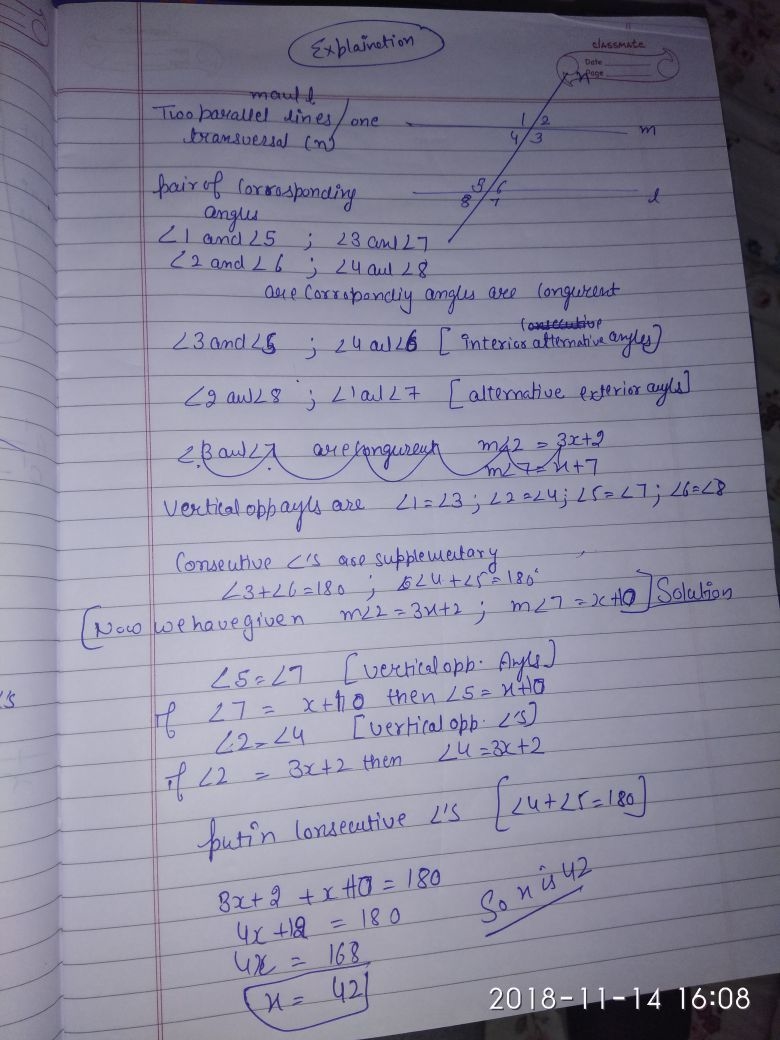 explanation of traversal line and parallel lines is given in image with an example of solution