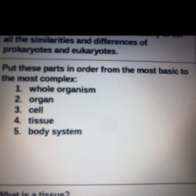 it's basically asking list smallest to largest. In order, it is cell, tissue, organ, body system, whole organism