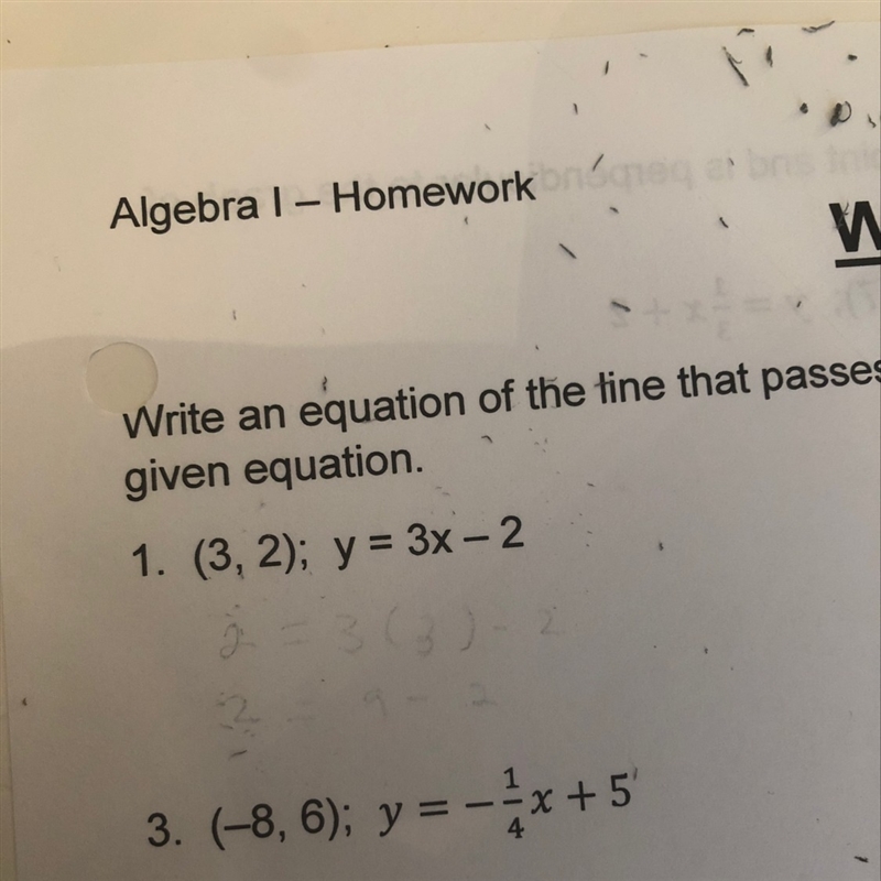 I would recommend taking a picture of the instructions because I am not sure if you need to find the equation of the line that is parallel or perpendicular, so I will do both.