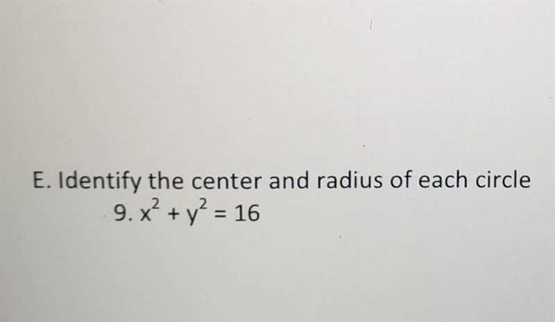 The center is (0,0) and the radius is 4. Hope this helps ;)