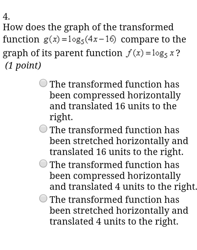 Answer: Choice #3 - compressed horizontally and translated by 4 units to the right.