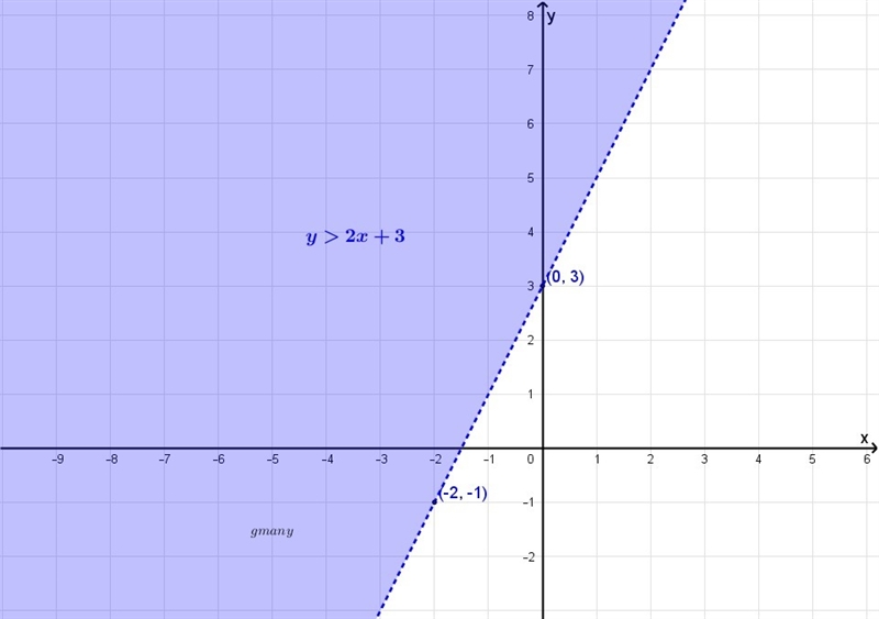 y = 2x + 3 - it's a linear function. We only need two points to plot the graph. Select two any x values and calculate the y values: