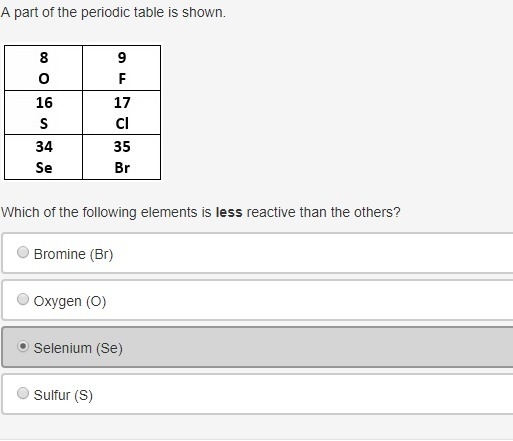 Selenium should be correct. I don’t know if you just clicked on it And waited to submit or if you got it wrong. Anything in the halogens (which is the second column) that your looking at) would be very reactive.