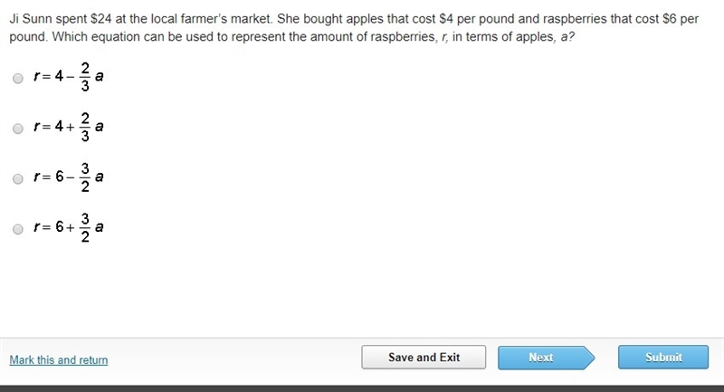 To solve this, we can start by finding a general equation and then solving for r, or the amount of raspberries (in pounds). To find the general equation, we start with 24 as the amount of dollars. As we have the cost of apples as 4$ per pound, we must add 4 dollars for every pound and therefore multiply 4 by the amount of apples, or a. Similarly, we must multiply 6 by the amount of raspberries. So, as we know that 24 dollars equals the amount of some amount of apples and some amount of raspberries, we can write our original equation as 24=4*a+6*r. Next, using the additive property of equality, we can subtract 24 from both sides to get 0=4*a+6*r-24. This helps us isolate r, as we can then subtract 6r from both sides to get -6r=4*a-24. Similarly, as -6r/-6=r, we can divide both sides by -6 to get r=(-4/6)a-(-24/6)=(-4/6)a+4, making our answer a.