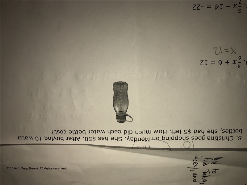 We know that there was $5 left over, so we can set up an equation to solve for the price per water bottle: