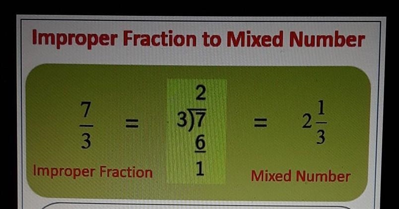 (We now have our answer, but to figure out the right bin to put this quotient in, it'll help to convert this improper fraction back to a mixed fraction. We do so by using ling divison. I've provided another image to show how that is done)