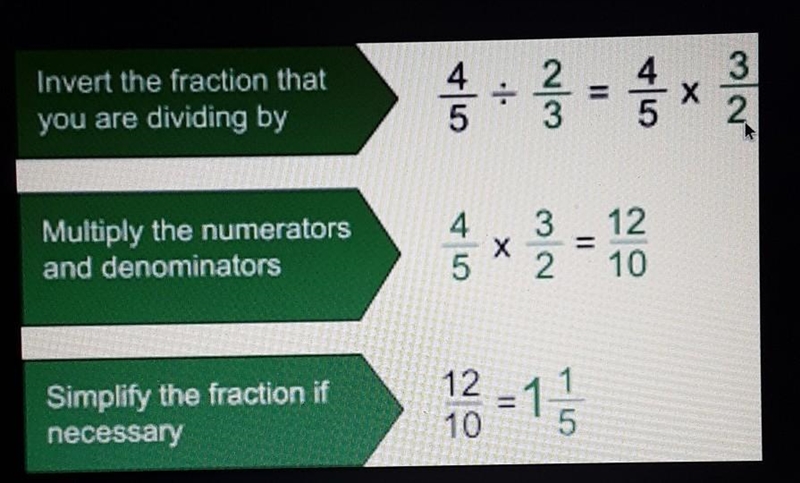 Using this reciprocal method changes the operation from division to multiplication, which is much easier :). You only invert ONE fraction and that's the one that's ALWAYS on the RIGHT, the one that you are dividing by.
