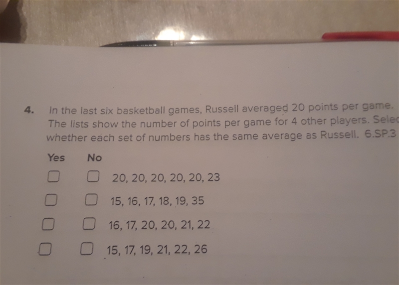 in the last 6 basketball games Russell averaged about 20 points per game in the list shown the number of points per game the four other players select whichever set of numbers has the average as Russell