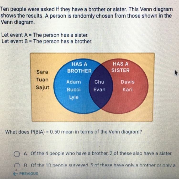 Of the 4 people who have a sister, 2 of these also have a brother.