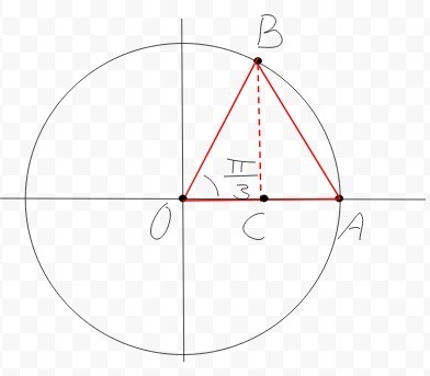 Since OB and OA have the same length, triangle OAB is isosceles, but more than that, it's also equilateral. Why? Because the interior angles of any triangle always add to