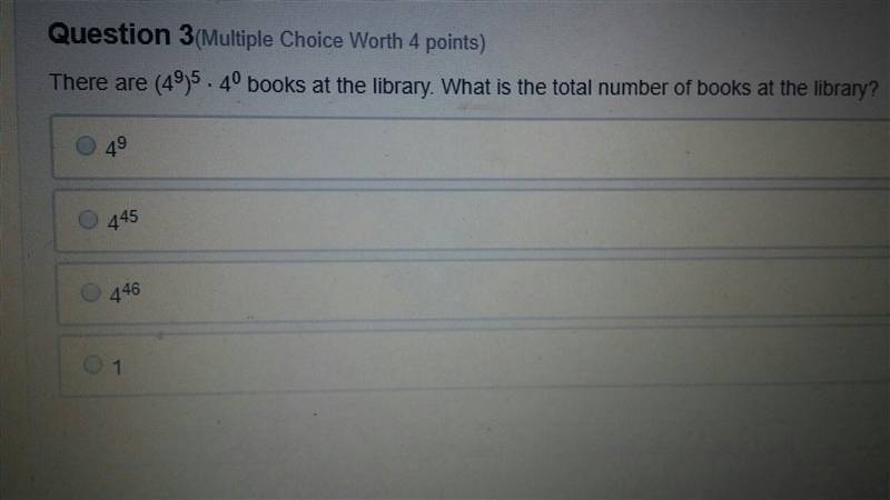 I need help please! The answer choices are: {4}^(9) {4}^(45) {4}^(46) 1