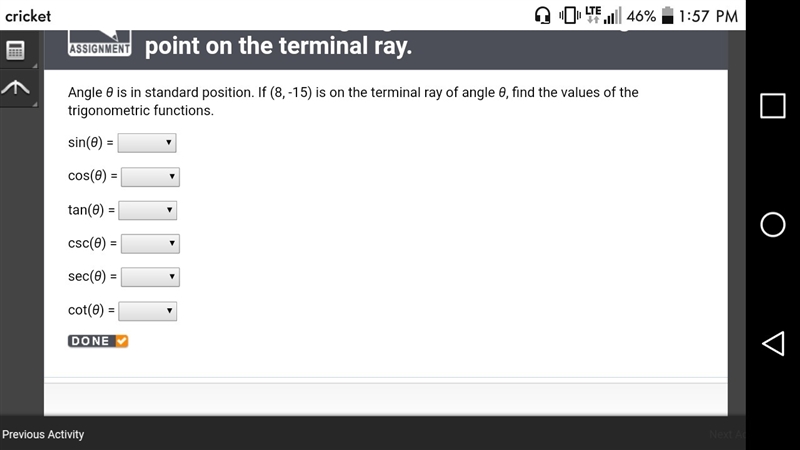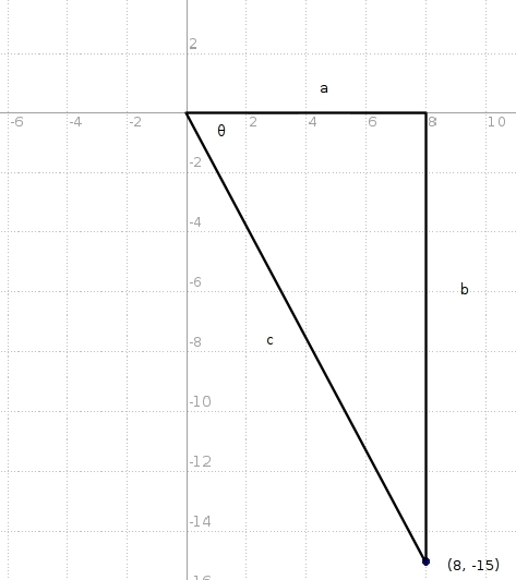 Angle θ is in standard position. If (8, -15) is on the terminal ray of angle θ, find the values of the trigonometric functions.
