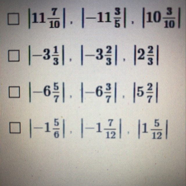 In the third list, 6 or -6 is the greatest value in the ones place 6>5. Let's look at the fractions. 5/7>3/7 since they share the same denominator we can compare just the numerators. 5>3. This list is correct.