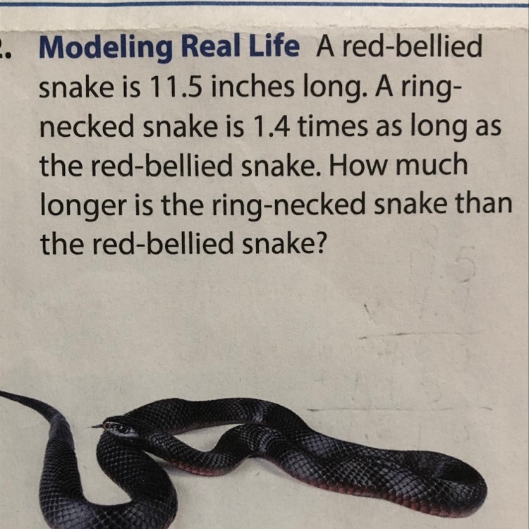 A red bellied snake is 11.5 inches long. A ring - necked snake is 1.4 times as long as the red bellied snake. How much longer is the ring necked snake then the red bellied snake
