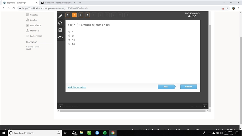 If f(x) = + 8, what is f(x) when x = 10? 4 9 13 36-example-1
