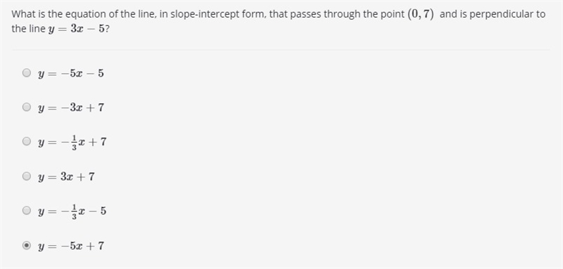 In order to find this, we first need to look at the slope of the original equation, which is 3. Perpendicular lines have opposite and reciprocal slopes, which would make the new line's slope -1/3. Knowing this, we can use the slope and the point in point-slope form to get the equation.