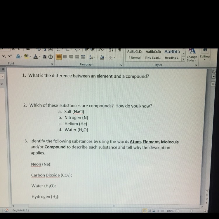 A. salt- compound (NaCl) is two elements Na (sodium) and Cl (chloride?)