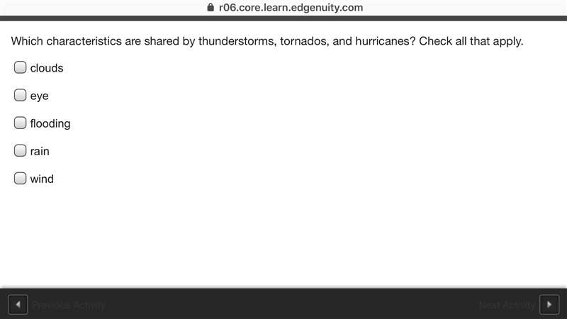Not all tornados happen when it's raining but all three have wind and clouds. Since raining doesn't always happen during tornados, flooding is out of the question.