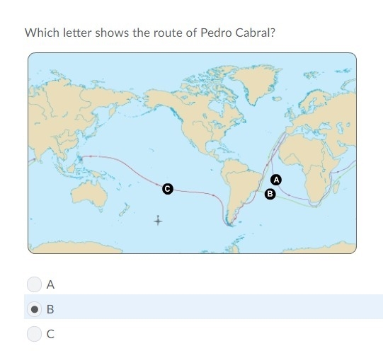 Please help asap! Which letter shows the route of Pedro Cabral?