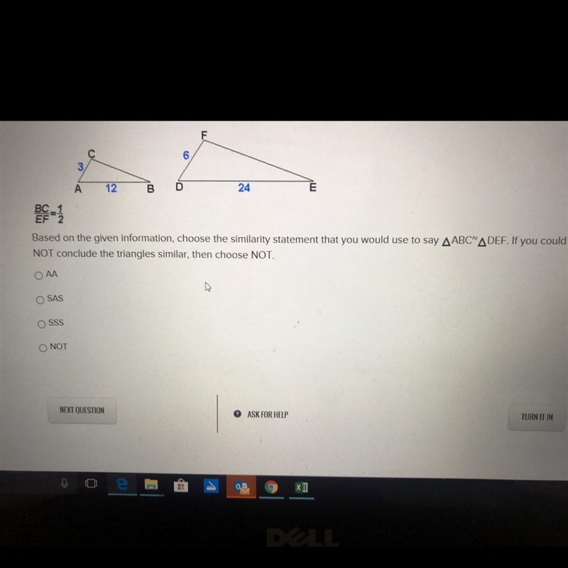 AC/DF = 3/6 = 1/2 and AB/DE = 12/24 =1/2