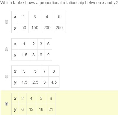 Please help quick!!! Which table shows a proportional relationship between x and y? x 1 3 4 5 y 50 150 200 250 x 1 2 3 6 y 1.5 3 6 9 x 3 5 7 8 y 1.5 2.5 3 4.5 x 2 4 5 6 y 6 12 1…