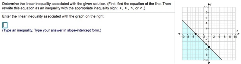 To find which inequality to use, plug in a point within your region and see if the statement is true. I would choose (-3,-3)