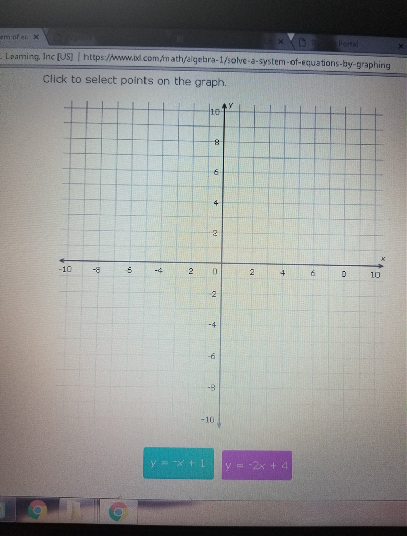 For y = -2x + 4, the slope is -2 (so it will also slope downwards), and the y-intercept is 4. Find (0, 4) and plot it. The -2 tells you to count 2 units down (instead of 1 like we did for the last equation) and 1 over. That is the second line.