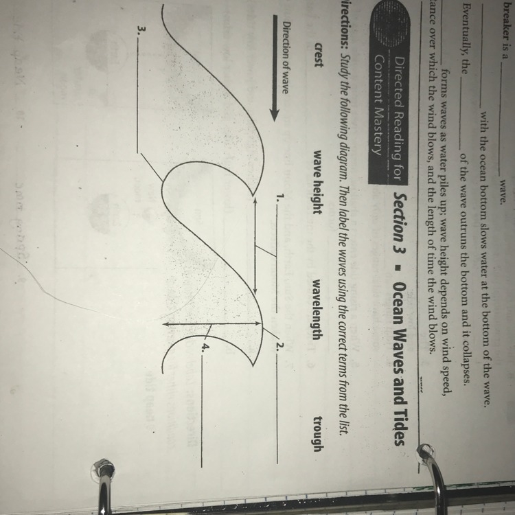 1 wavelength, 2 crest, 3 trough, 4 wave height <3