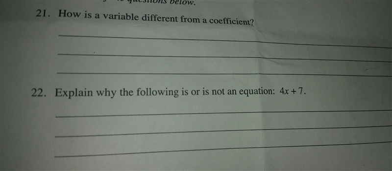 22: 4x + 7 is an *expression*. In order to make it an equation, we’d have to, well, set it equal to something! All equations require something to be equal to something else, so a statement like 4x + 7 = 23 would be an equation, but 4x + 7 on its own is not.