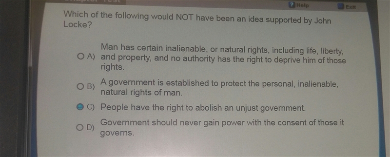 the answer is C) People have the right to abolish an unjust government. I believe it was Jefferson who had that philosophy. Hope this helps!