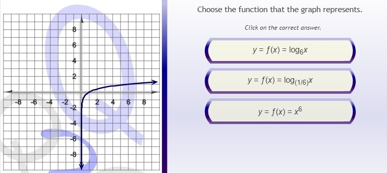 Note that log6 of 1 = 0 and log6 of 6 = 1 ( because 6^1 = 6) and the graph passes through these 2 points so the answer is the first choice.