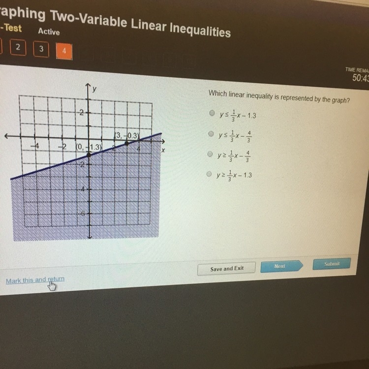 slope = (-1.3 - (-0.3) / (0 - 3) = (-1.3 + 0.3) / -3 = -1/-3 = 1/3