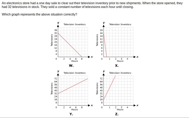 they cleared out the store the day before with a sale the next day the store only has 32 in their inventory if the sold the same amount until closing that sells 4 TV's per hour which adds up to 8 hours also they loose 4 every hour causeing the inventory line to go downward until sold out 8 hours later