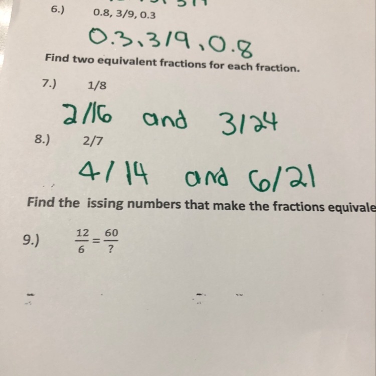 Find the missing numbers that make the fractions equivalent 12/6 = 60/?