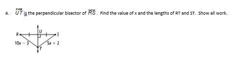 is the perpendicular bisector of . Find the value of x and the lengths of RT and ST. Show all work.
