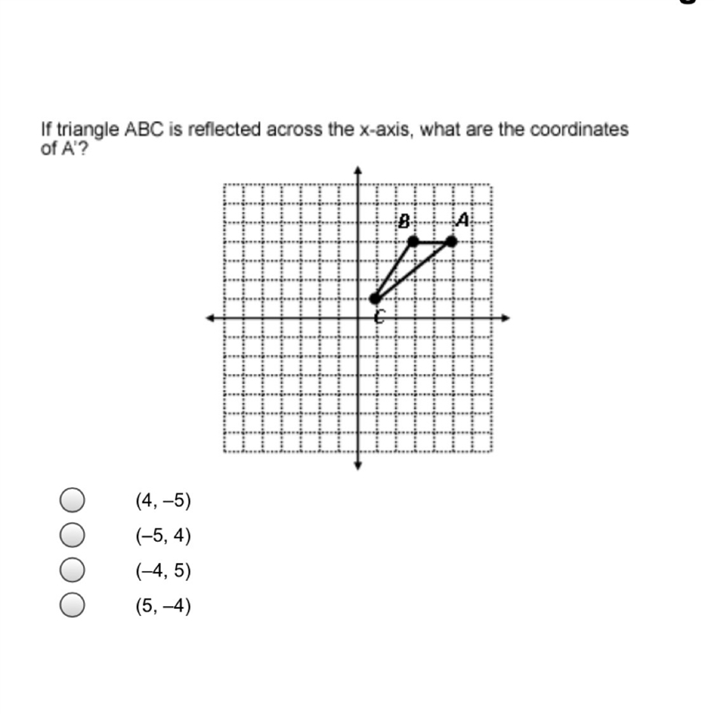If triangle ABC is reflected across the x-axis, what are the coordinates of A? 1. (4,-5) 2. (-5,4) 3. (-4,5) 4. (5,-4)