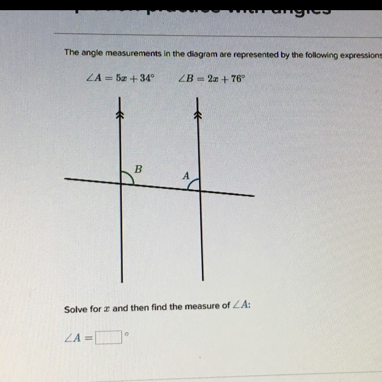 Please help!! The angel measurements in the diagram are represented by the following expressions A=5x+34 B=2x+76 Solve for x and then find the measure of A A=___