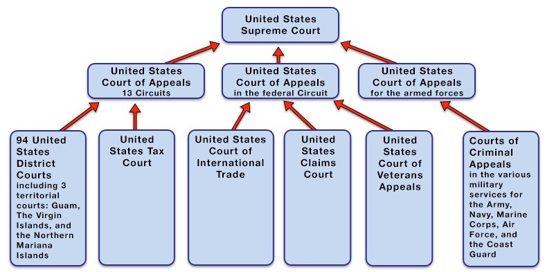 The graph shows the different circuits, depending on the type of legal sue, that a judicial procedure might encounter until reaching the US Supreme Court, as the highest court of appeal in the US judiciary system.
