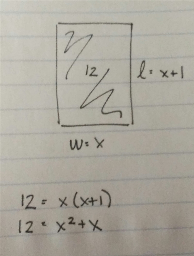 Kim is making rectangular greeting cards. Each card has an area of 12 square inches and the length is 1 inch more than the width. Find the length and width of her cards. If x represents the width of each card, select all of the equations that could be used to solve this problem.