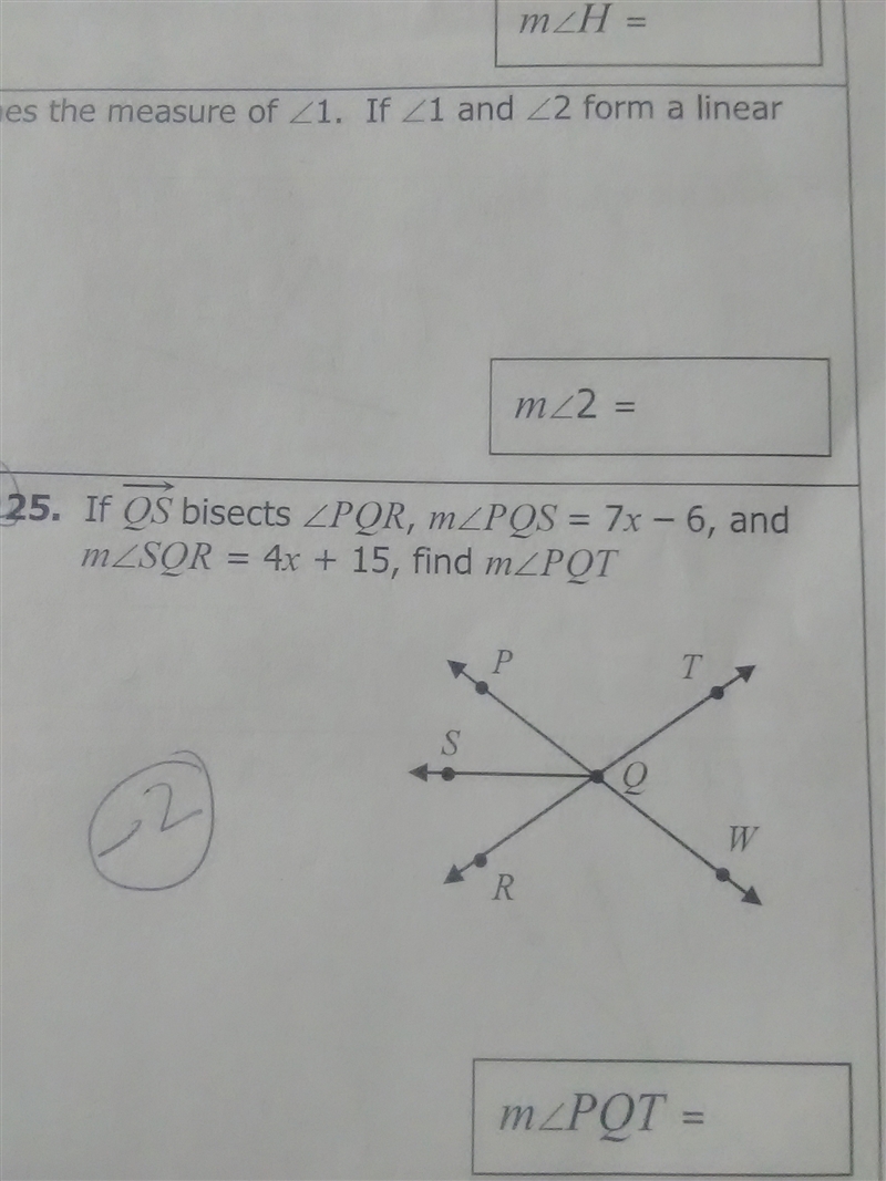 Equal 7x-6 to 4x+15 find the degree and to find pqt do 180 minus the degree you got