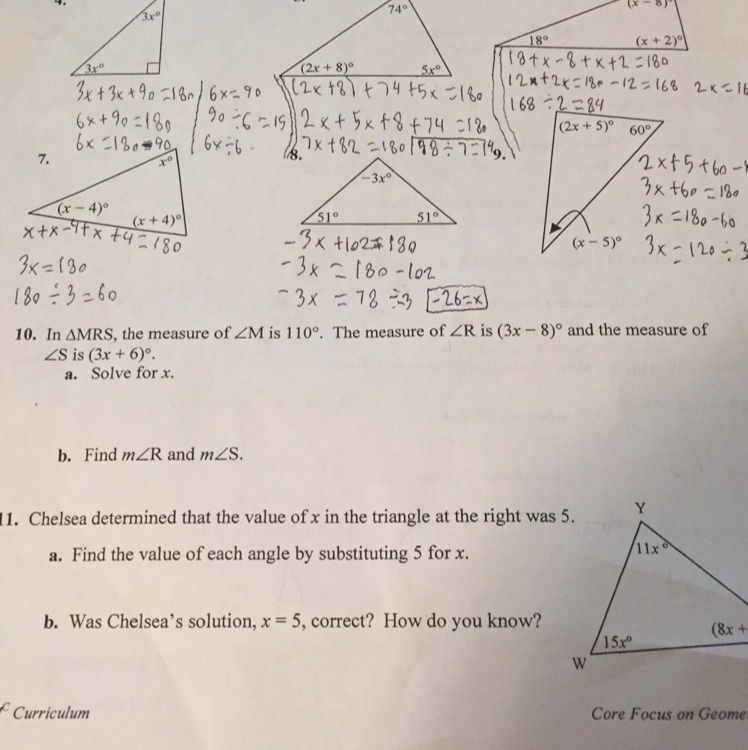 Question number 10 is the same as the previous questions add them up and make them equal to 180 degrees, and then solve for the x variable.