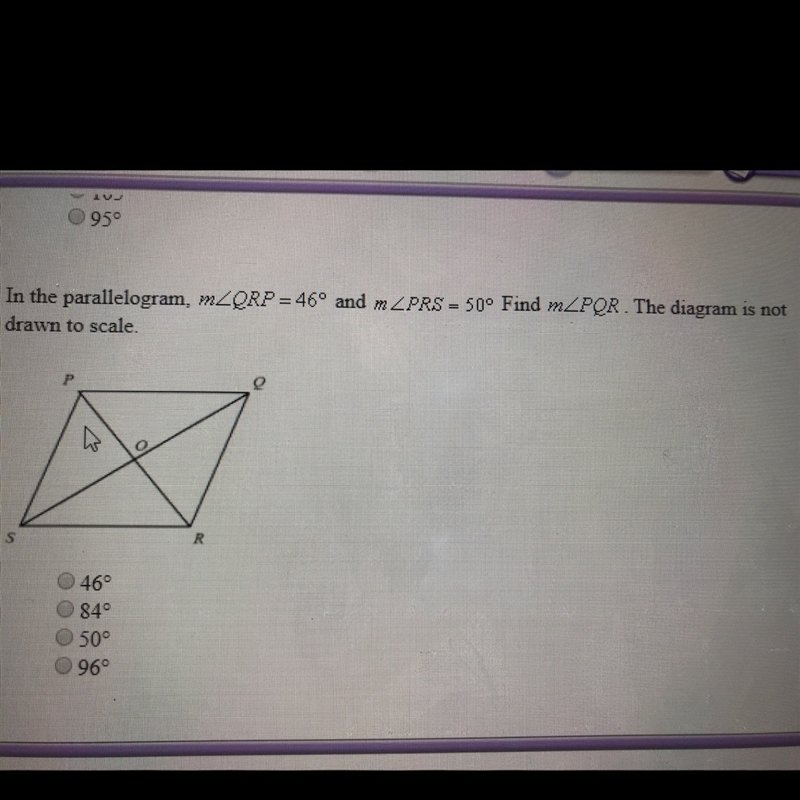 I think its either 84 or 96 but i would go with 84 because you add 50+46 is 96 then subtract 180-96=84 so i think its 84 :)