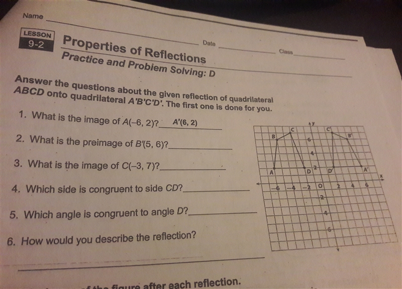 Answer the questions about the given a reflection of quadrilateral ABCD onto quadrilateral ABCD the first one is done for you HELP PLEASE