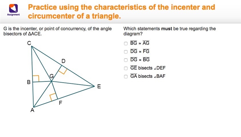 G is the incenter, or point of concurrency, of the angle bisectors of ΔACE. Which-example-1
