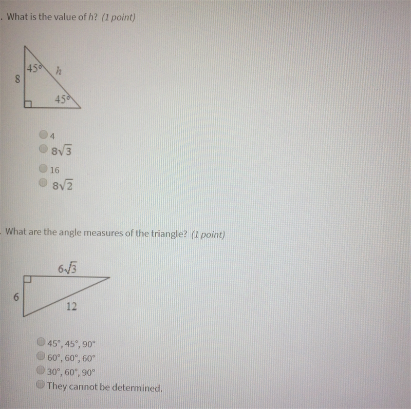 Question 1:This is a 45-45-90 right triangle. If the leg length is