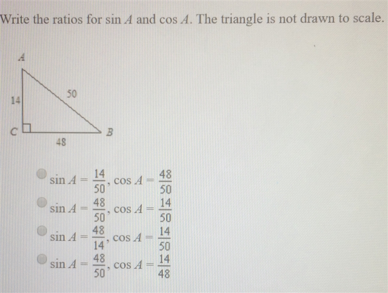 The length of the side adjacent to angle A is 14. The length of the hypotenuse is 50.