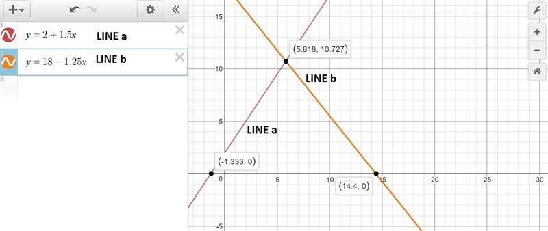 Use the line drawing tool to draw the equation upper y equals 2 plus 1.50 upper xy=2+1.50x. label your line 'a'. 2.) use the line drawing tool to draw the equation upper y equals 18 minus 1.25 upper xy=18−1.25x. label your line 'b'.
