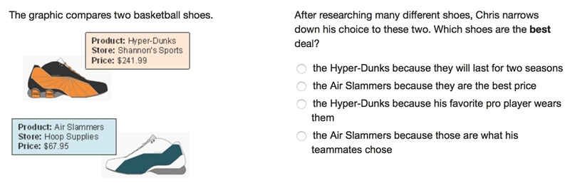 The graphic compares two basketball shoes. After researching many different shoes, Chris narrows down his choice to these two. Which shoes are the best deal? 1 the Hyper-Dunks because they will last for