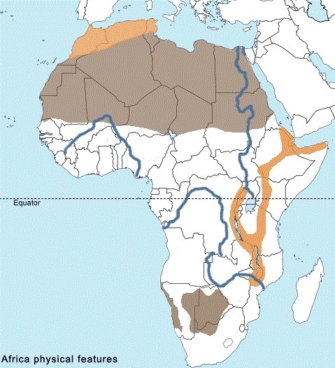 Which geographic features best enabled migration in the interior of Africa? Select two. A. Atlas Mountains B. Congo River C. Great Rift Valley D. Kalahari Desert E. savannas F. tropical rain forests